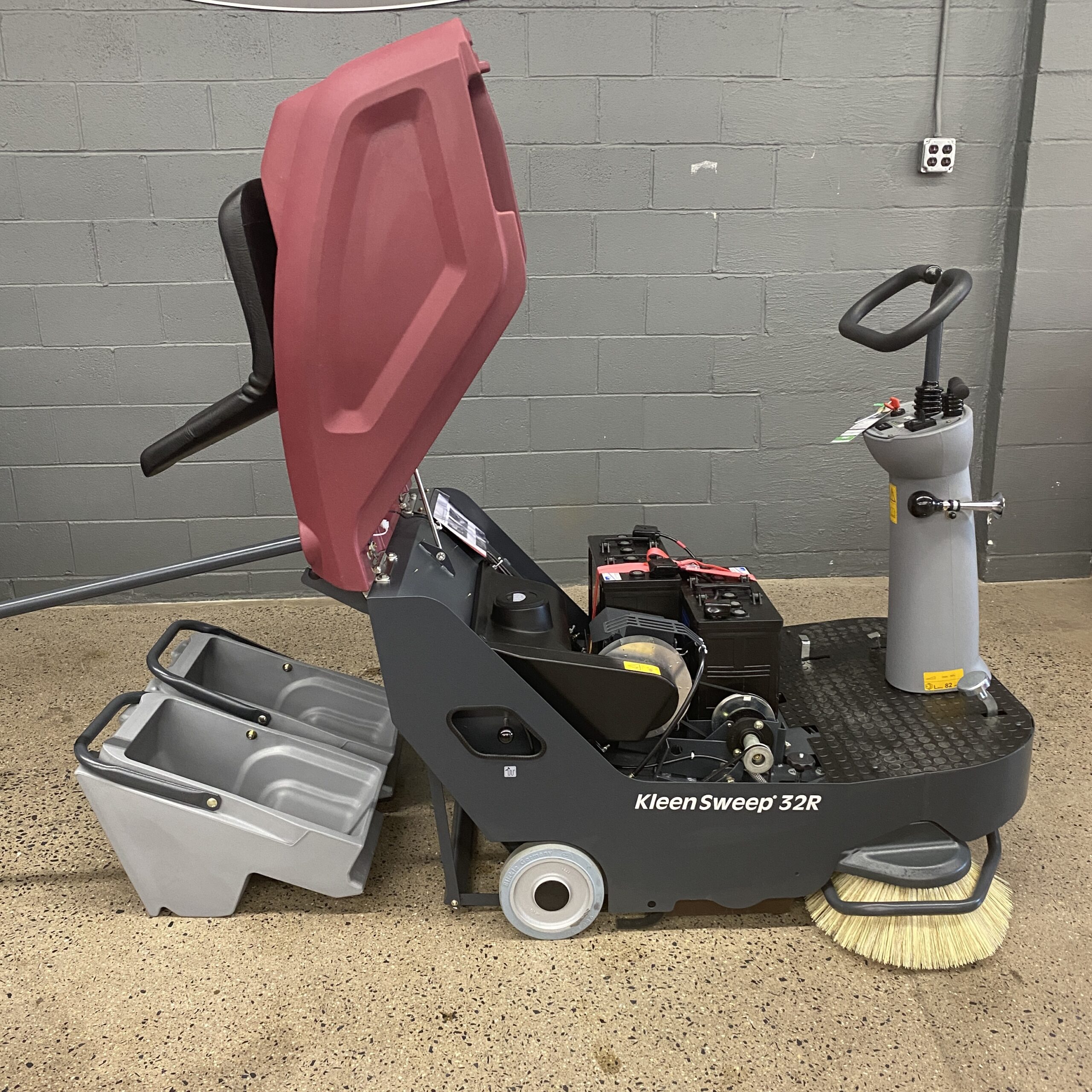The battery-powered Kleen Sweep 32R (aka Sweepmaster KS32R) combines the compact dimensions of a walk-behind vacuum sweeper with the superior comfort and performance of a ride-on machine to provide fast and efficient cleaning of small to medium-sized areas.